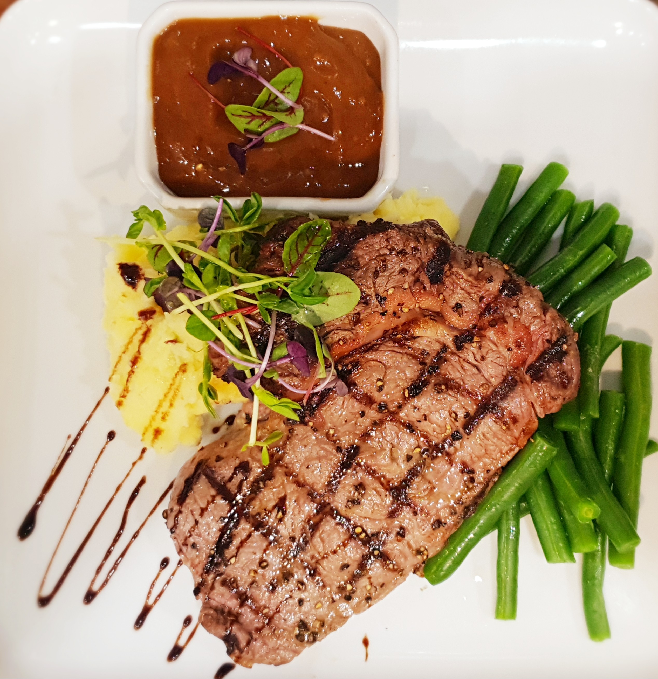 250 gms pasture fed scotch fillet served with parmesan mash or chips or salad, green beans and choice of sauce (mushroom, pepper or gravy) on bed of pesto (contains nut)