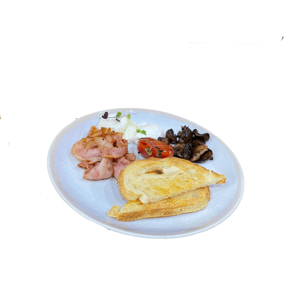2 free range eggs anyway you like with roasted mushrooms & grilled tomato, served with choice of either bacon or sausage with sourdough