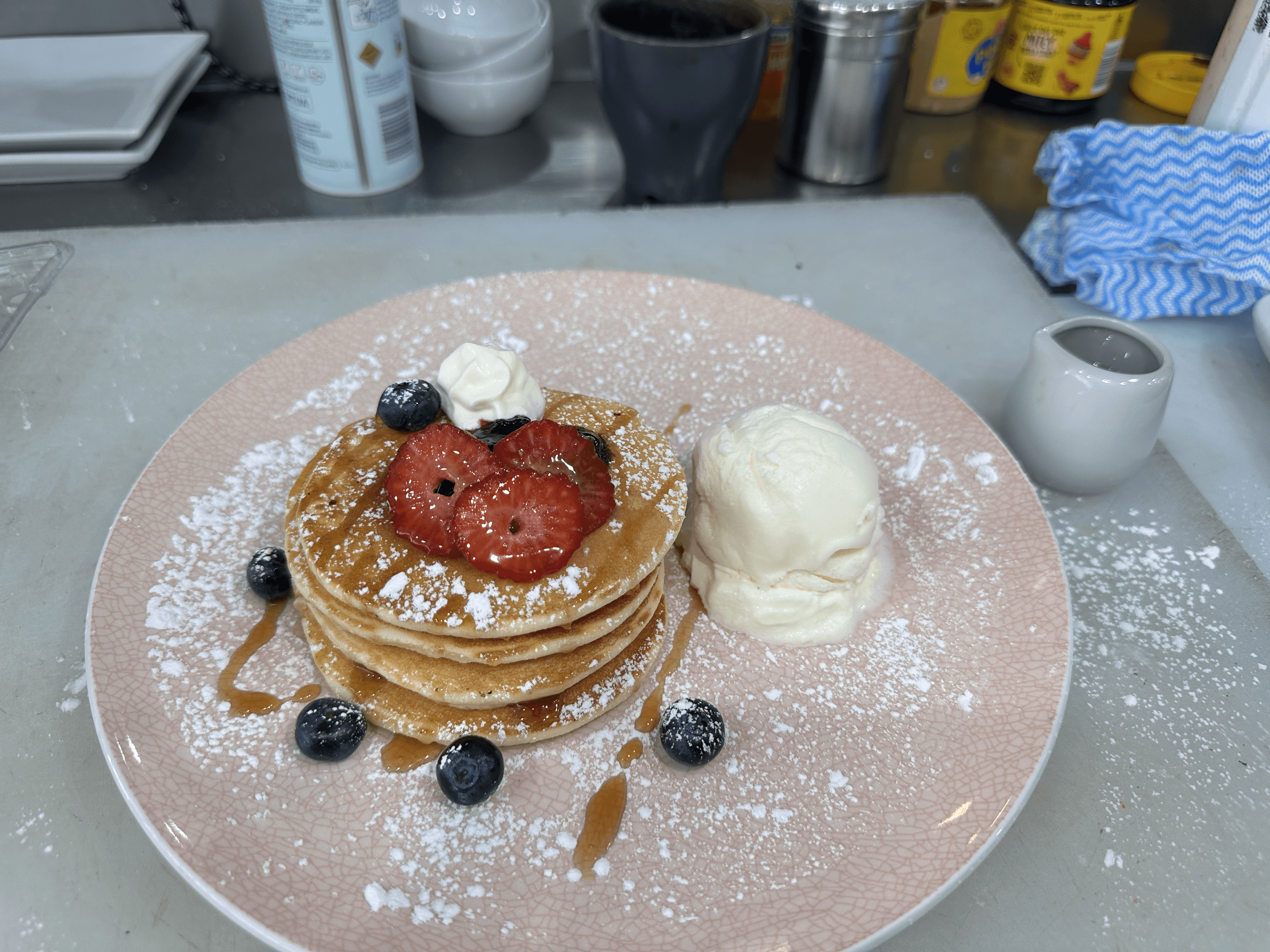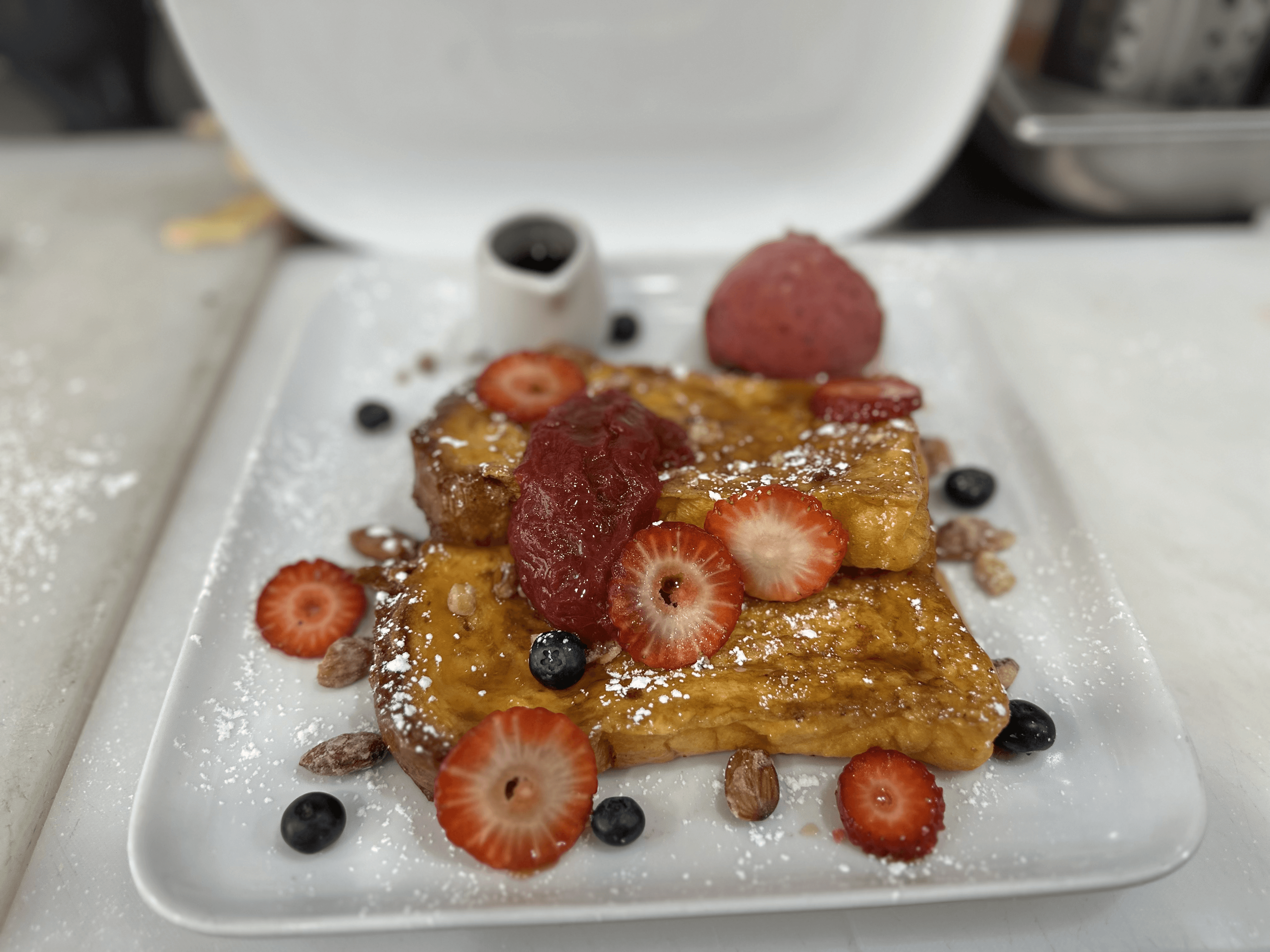 Served with berry compote,maple syrup and ice cream