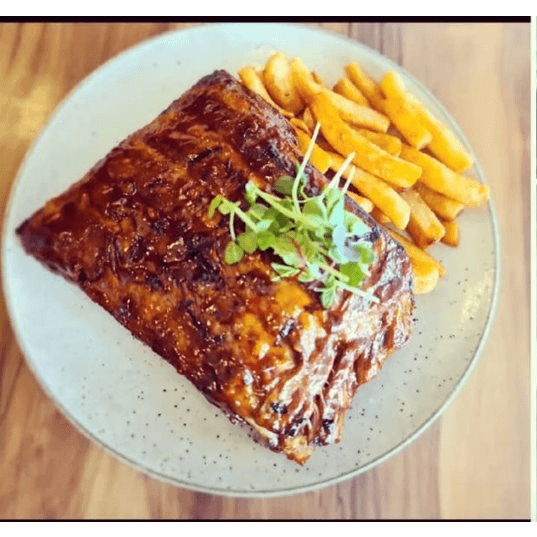 House slow cooked BBQ pork Ribs with housemade BBQ basting served with mash or chips or salad