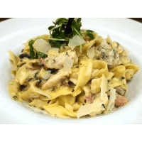 With egg fettuccine, chicken, bacon, garlic, mushroom abd white wine cream sauce
