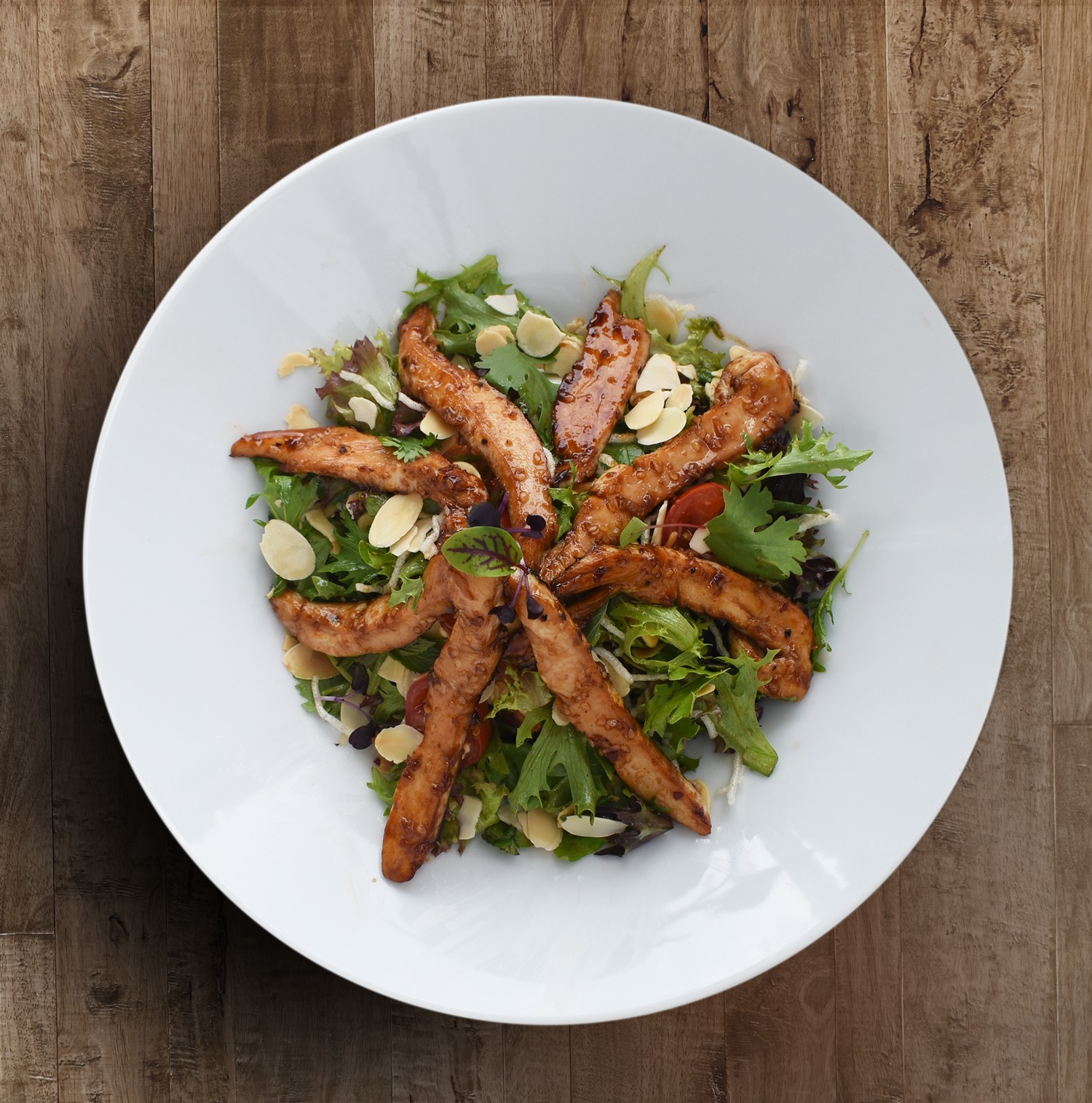Saute chicken breast on house made Thai sauce, toasted peanuts, almond flakes, vermicelli fried, mesculin, cherry tomato coriander & mint with tangy Thai dressing