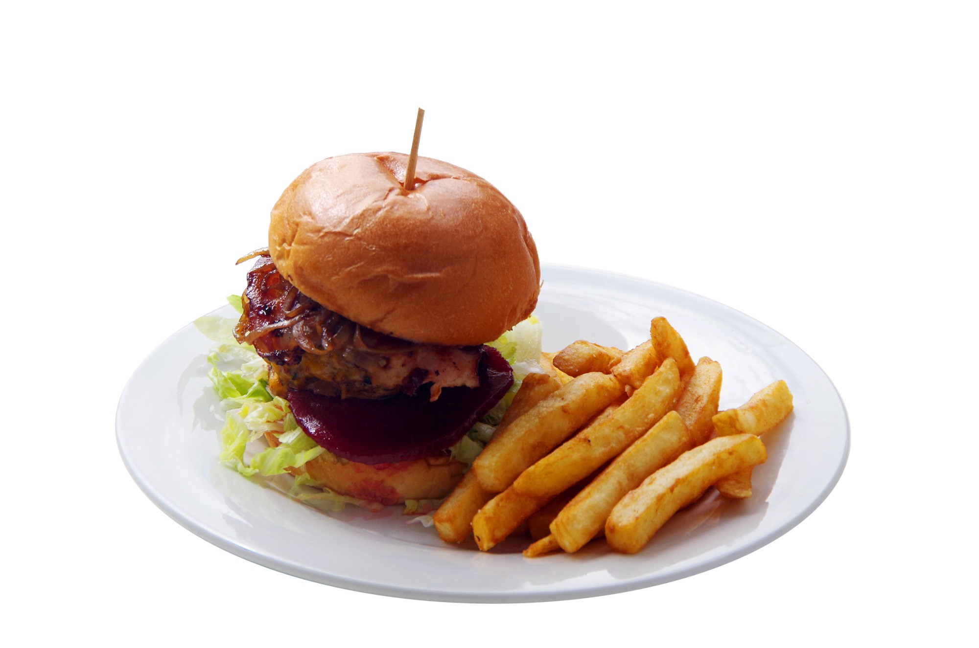 Wagyu beef patty, lettuce, caramalised onion, bacon, beetroot and American red cheddar cheese with hickory smoked BBQ sauce served with beer battered chips