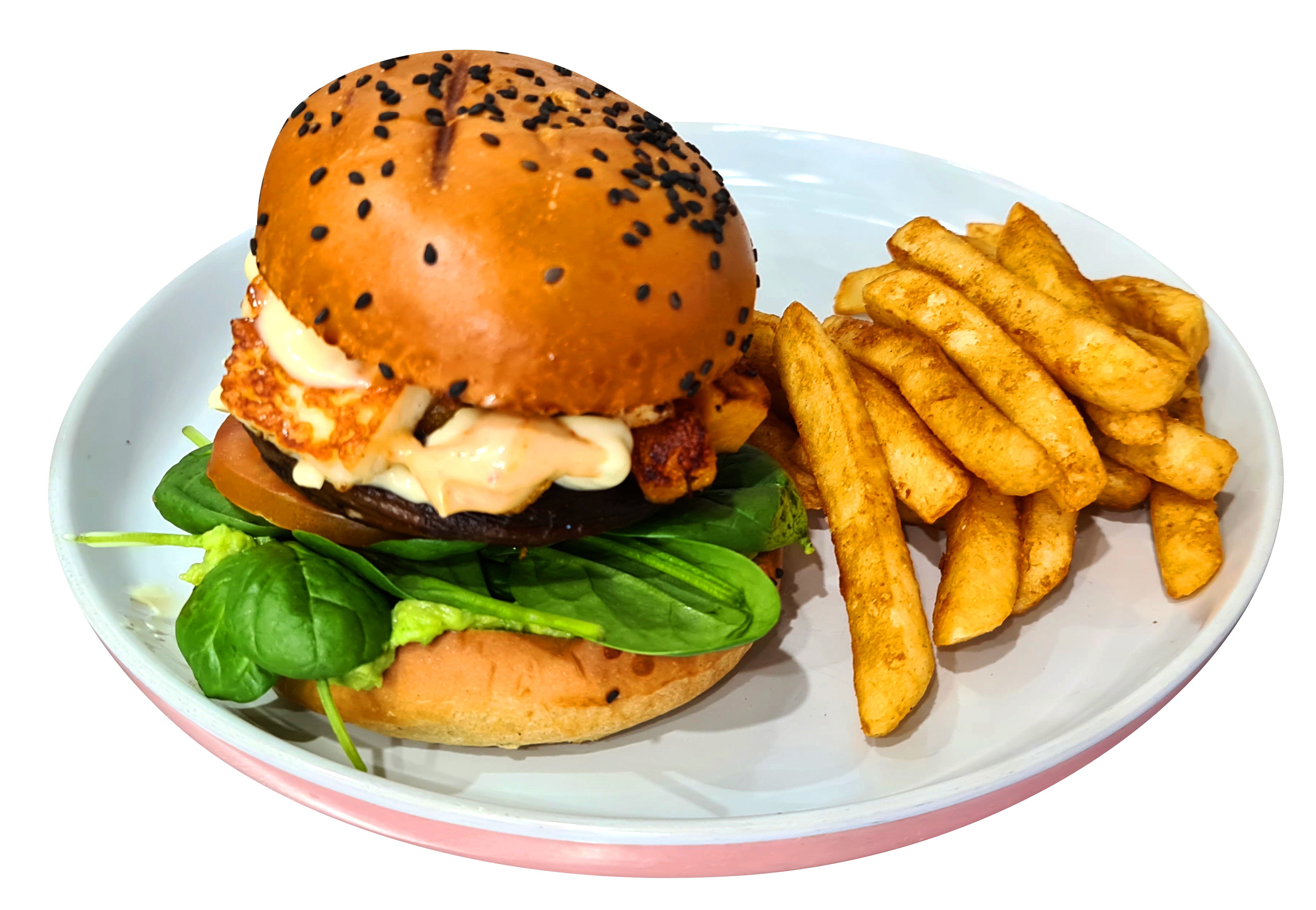 Roasted mushrooom avacado, sliced tomato, roasted butternut pumpkin, spinach with grilled haloumi served with beer battered chips with dill mayo or peri peri mayo ( vegan sauce)