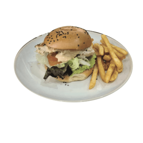 Panko crumbled barramundi fillet with lettuce, tomato, onion and our house made dill mayo & peri-peri mayo (mild) served with beer battered chips