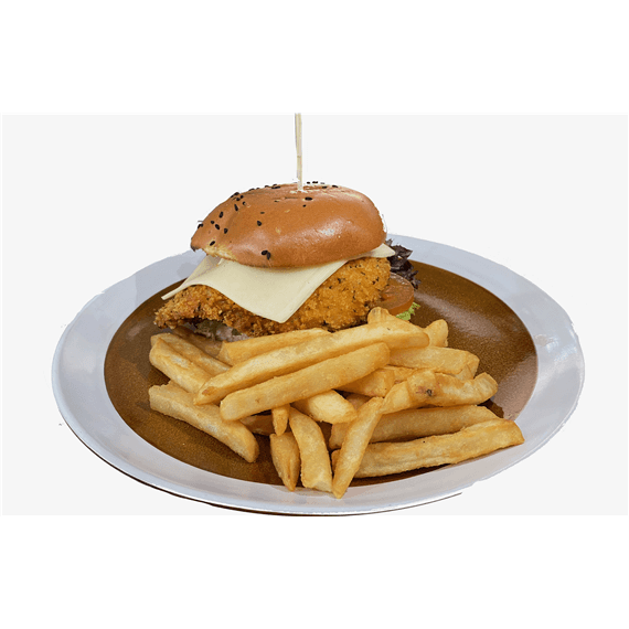 Japanese panka crumbled tender chicken breast fillet with lettuce, tomato, aioli and swiss cheese