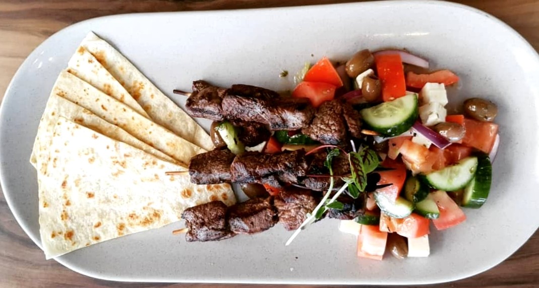 Marinated tender lamb fillet skewers served with Greek salad, tortilla bread and Tzatziki sauce