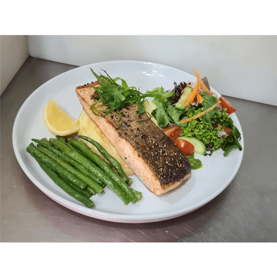 With buttered green beans, lemon and choice of parmesan mash or chips or salad on bed of pesto (contains nuts)